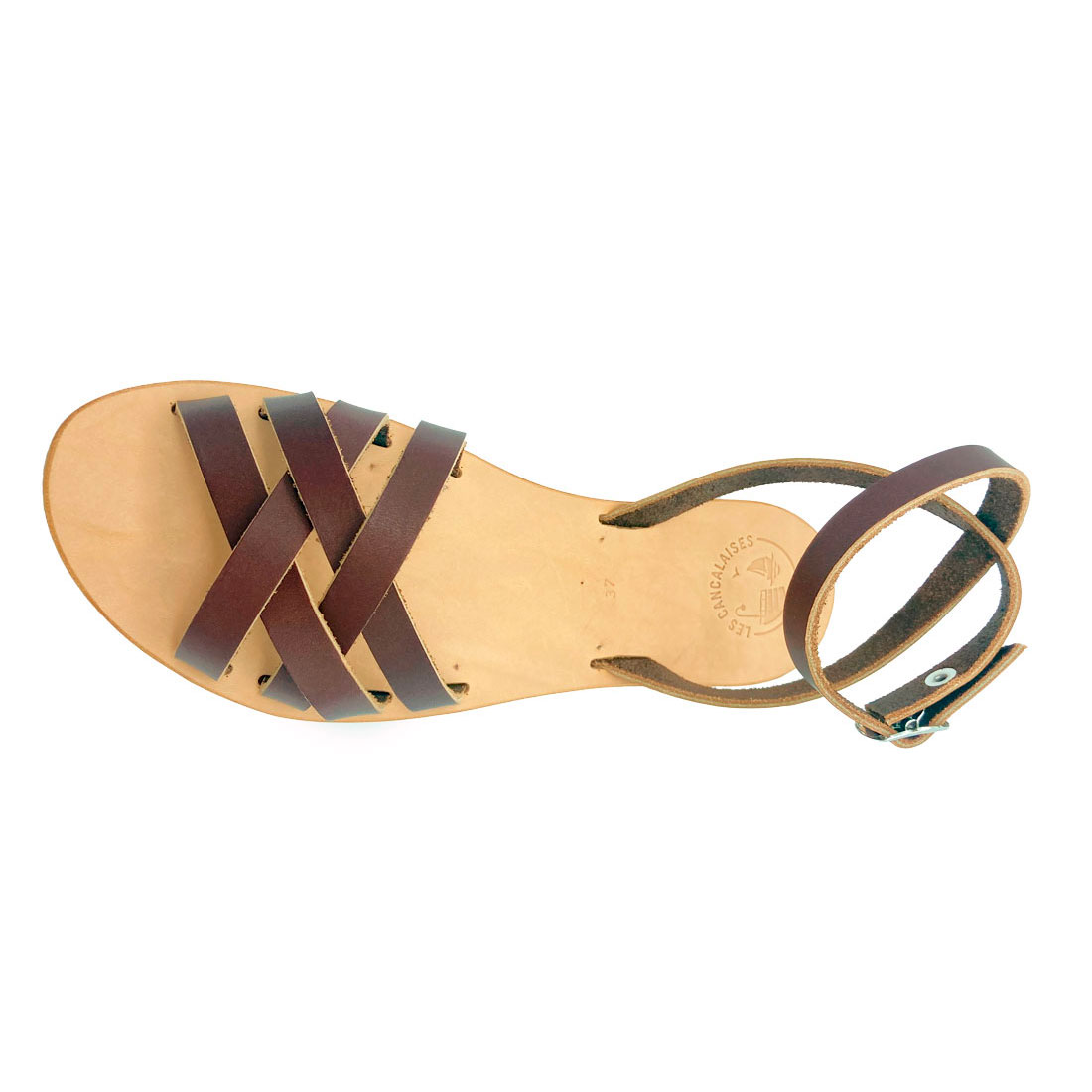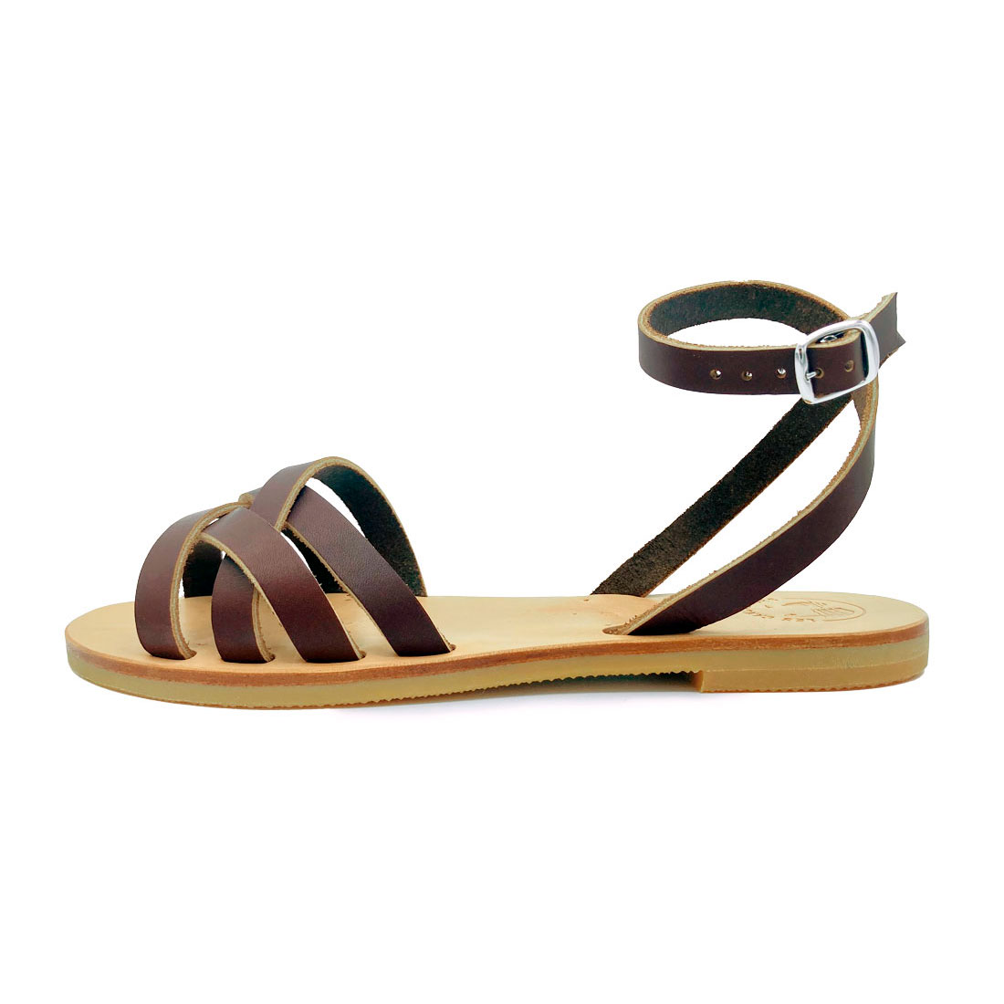 4 lanières entrecroisées de 12 mm et une bride arrière qui fait le tour de la cheville • Première en cuir à tannage végétal • Semelle en caoutchouc antidérapante.
